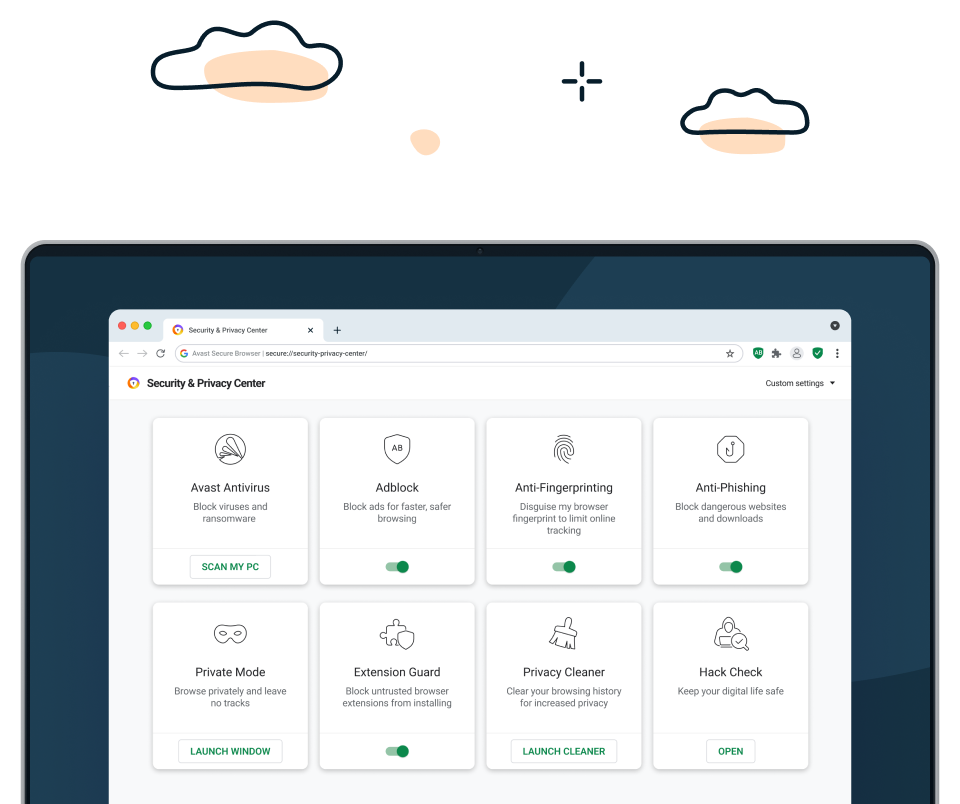 Налаштувати Avast Secure Browser просто. Усі вбудовані інструменти безпеки та конфіденційності готові до роботи з моменту запуску браузера. Ними можна без особливих зусиль керувати через нашу зручну сторінку налаштувань. Крім того, браузер Avast Secure Browser сумісний з іншими додатковими модулями для Chrome, тож ви зможете налаштувати перегляд сайтів відповідно до своїх потреб за допомогою вебмагазину Chrome.